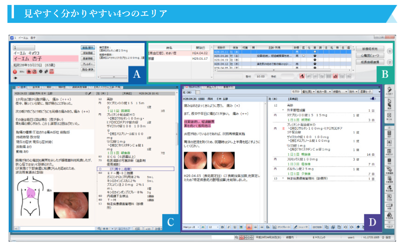 メディカルレセプティネクストは、患者属性情報エリアやカルテヘッダー表示エリアを含む4つのエリアで情報を整理。必要な情報へのアクセスを直感的に行えます。