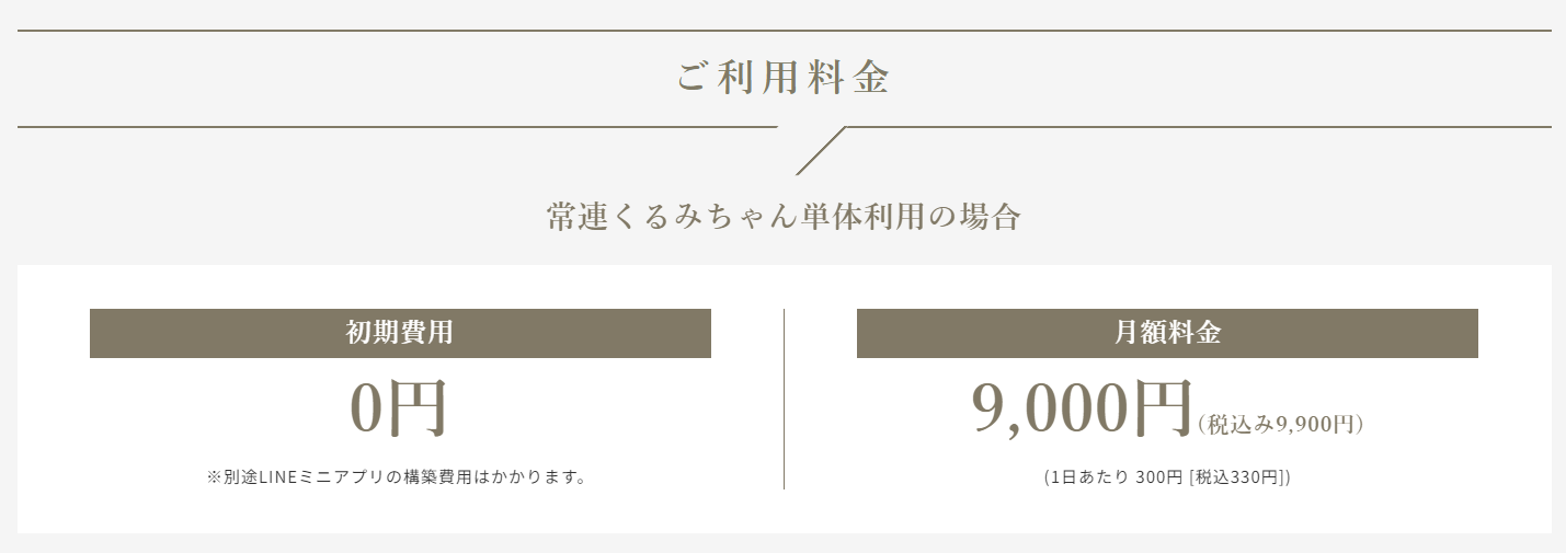 初期費用0円(別途LINEミニアプリ構築費用)、月額9,000円(税込9,900円)