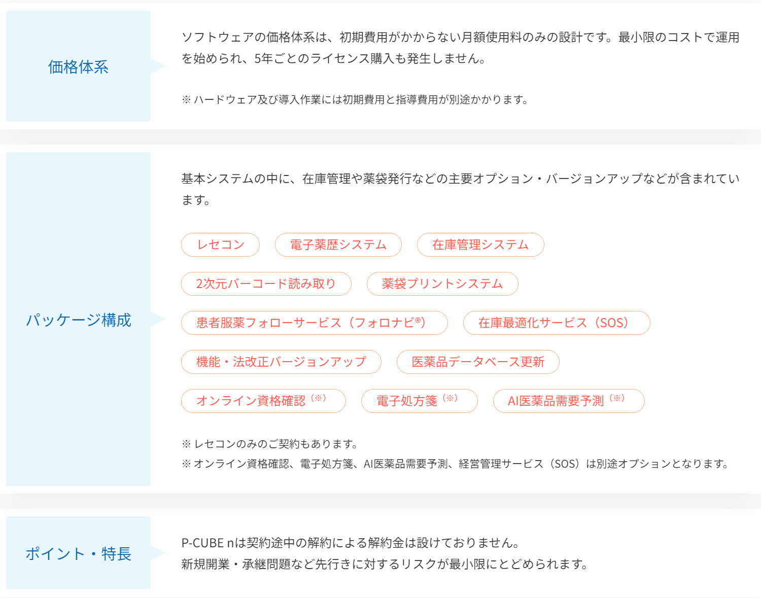 月額使用料のみの設計で、初期費用なし。ハードウェア及び導入作業には別途初期費用と指導費用が必要。
