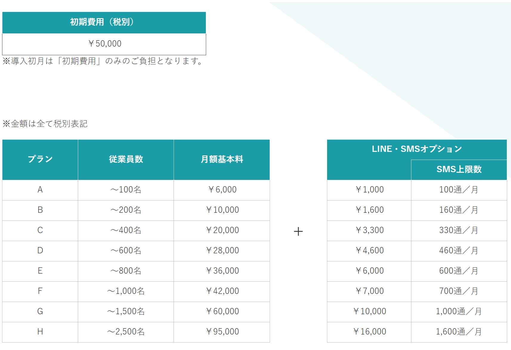 初期費用 50,000円(税別)、月額基本料 6,000円~95,000円(従業員数に応じたプラン)、LINE・SMSオプション 1,000円~16,000円(税別)