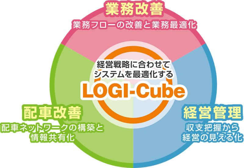 「LOGI-Cube」は運送管理システム「EXPRESS」と倉庫管理システム「STORAGE」を含む物流システムで、荷主への売上実績・請求、傭車先への傭車料実績・支払い管理、日次・月次・随時での実績確認、入金処理、支払処理による売掛管理・買掛管理、請求管理、運賃計算などが行えます。また、運転日報の入力、乗務員・車両の実績管理・経費管理、配車支援システムでの受注情報(配車情報)の入力、各種指示書・点呼記録簿・配車管理なども行えます。