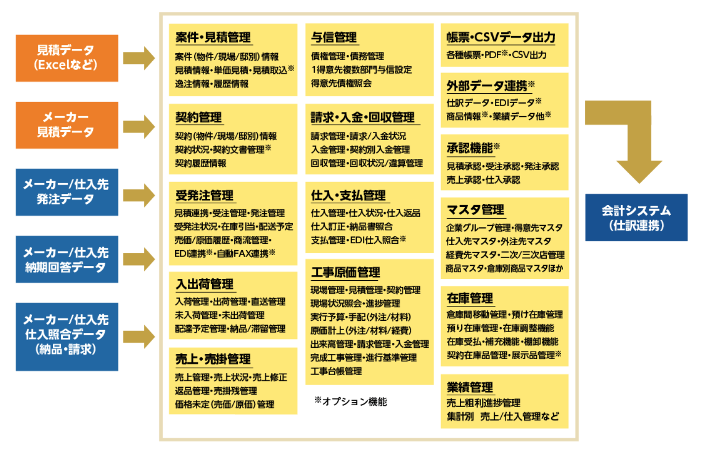 20年以上のノウハウが詰まった業種特化型次世代統合基幹システム。リアルタイムで経営数値が掴め、スピード判断が可能。見積から回収状況まで一気通貫で管理でき、業務プロセスの標準化、効率化、精度向上が図れる。