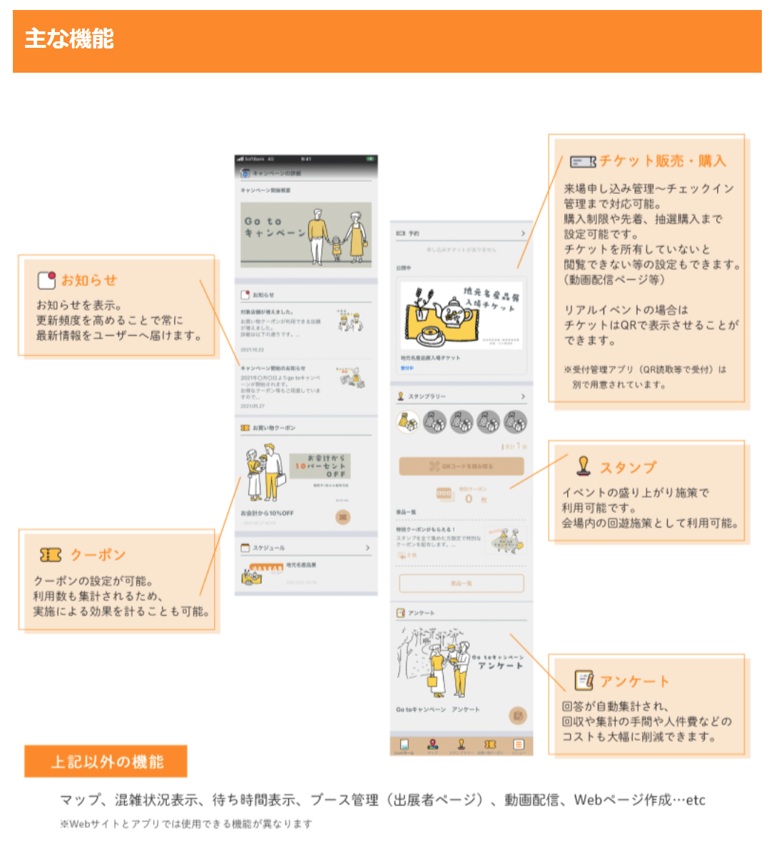 webとモバイルアプリを同時に作成でき、情報更新も簡単に行うことができる。イベントwebサイトの構築からlive配信・収録動画の配信等様々な機能を提供。